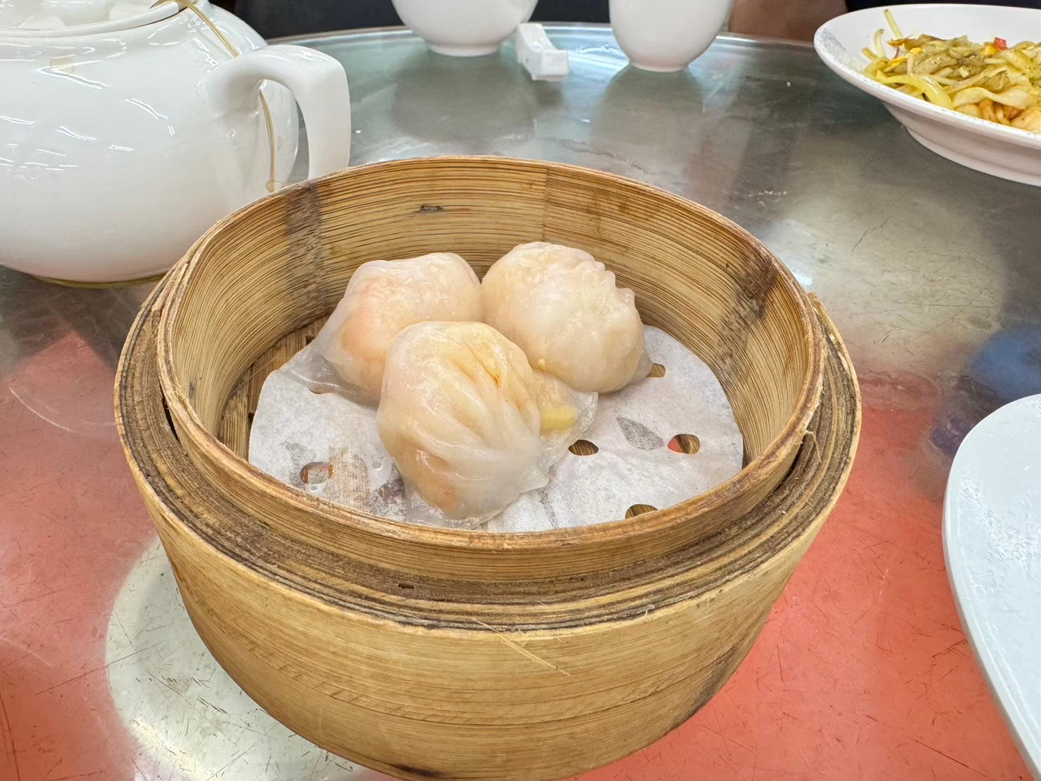 カートで点心を運んでくるのを声かけて止めて蒸篭の中身を見せてもらって、欲しいものをとって食べるという方式の様子(店内の雰囲気わかるような写真を撮り忘れた)。止めたら止めたで点心を運んでいるおばちゃんの圧がそこそこ強くまず疲れた笑 もう少し観光客向けに説明とか色々あると思って何も予習せずにきたら、飲茶の "いろは" が全くわかっていないのでまず困ってしまったのも疲れの要因。